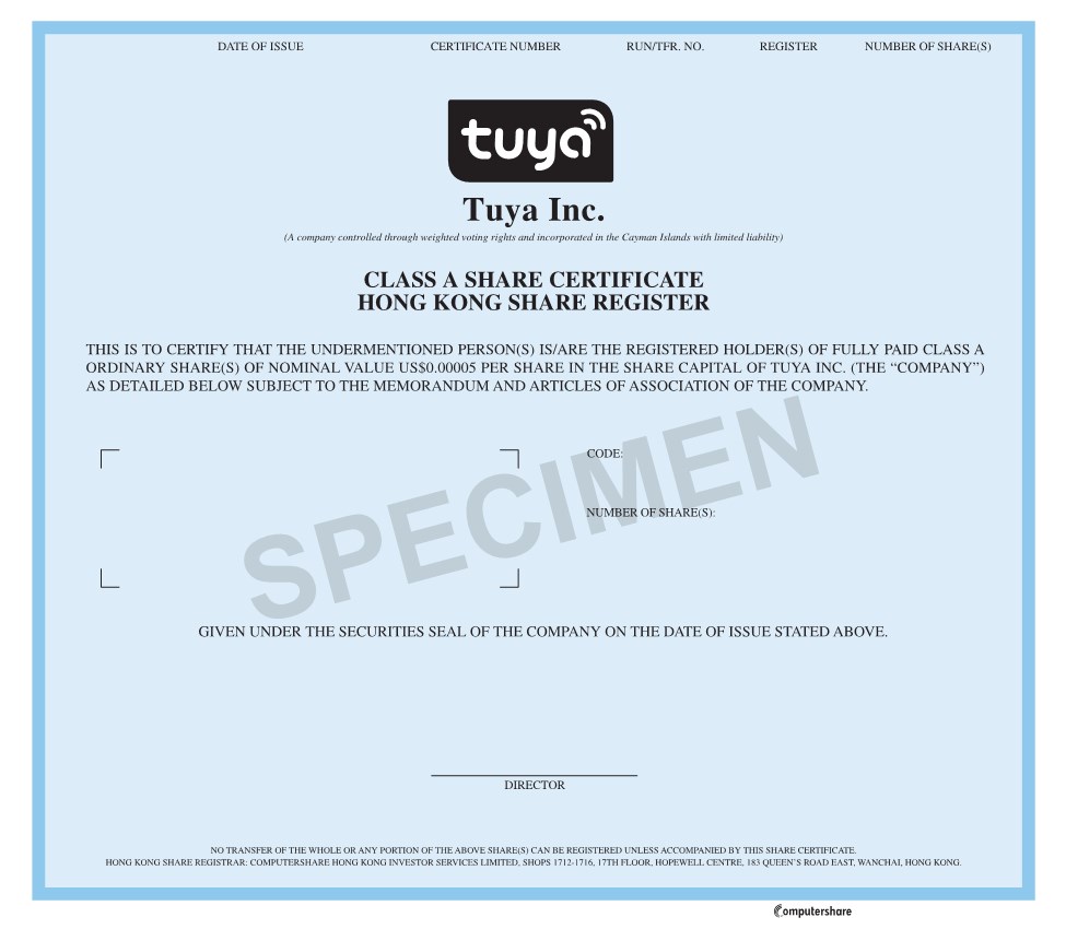 CLASS A SHARE CERTIFICATE HONG KONG SHARE REGISTER DATE OF ISSUE CERTIFICATE NUMBER RUN/TFR. NO. REGISTER NUMBER OF SHARE(S) CODE: NUMBER OF SHARE(S): GIVEN UNDER THE SECURITIES SEAL OF THE COMPANY ON THE DATE OF ISSUE STATED ABOVE. DIRECTOR NO TRANSFER OF THE WHOLE OR ANY PORTION OF THE ABOVE SHARE(S) CAN BE REGISTERED UNLESS ACCOMPANIED BY THIS SHARE CERTIFICATE. HONG KONG SHARE REGISTRAR: COMPUTERSHARE HONG KONG INVESTOR SERVICES LIMITED, SHOPS 1712-1716, 17TH FLOOR, HOPEWELL CENTRE, 183 QUEEN’S ROAD EAST, WANCHAI, HONG KONG. THIS IS TO CERTIFY THAT THE UNDERMENTIONED PERSON(S) IS/ARE THE REGISTERED HOLDER(S) OF FULLY PAID CLASS A ORDINARY SHARE(S) OF NOMINAL VALUE US$0.00005 PER SHARE IN THE SHARE CAPITAL OF TUYA INC. (THE “COMPANY”) AS DETAILED BELOW SUBJECT TO THE MEMORANDUM AND ARTICLES OF ASSOCIATION OF THE COMPANY. Tuya Inc. (A company controlled through weighted voting rights and incorporated in the Cayman Islands with limited liability) V1.1 |